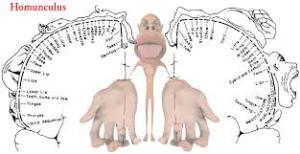 Penfield (1891-1976),Canadian brain surgeon,created a brain map showing which part of body correspond to the cerebrum.?The size of each body part and the size corresponding to the brain map are not in a proportional relationship.?In other words,hands and face move more finely than the feet, so the proportion of hands and face in the cortex is much wider than that of the feet.?The same can be said for the senses.